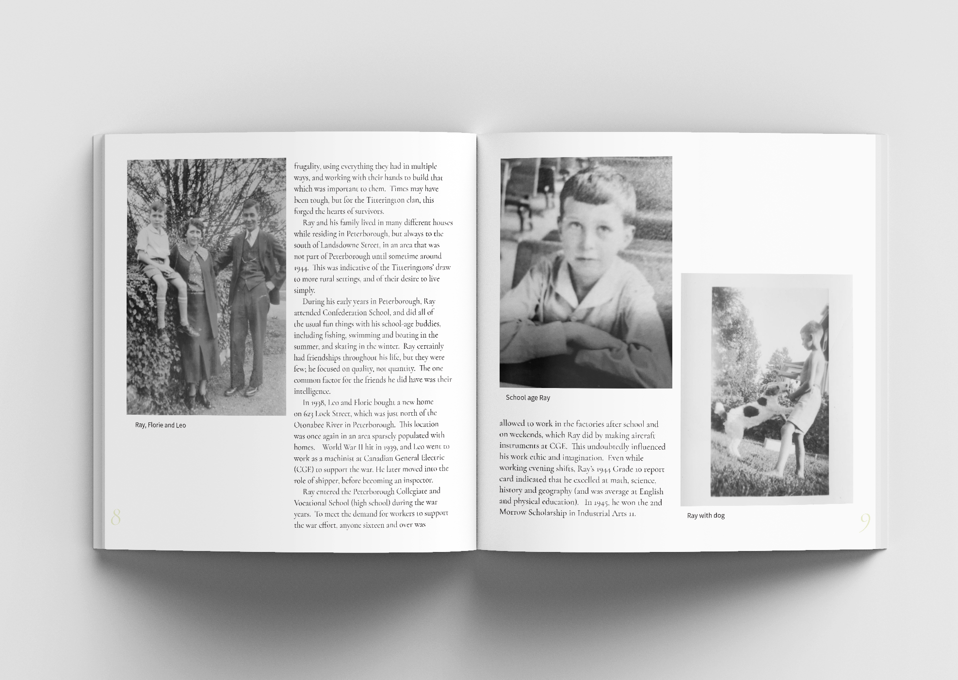 A square 8 × 8 format was chosen to create an intimate, keepsake-like feel, well suited to a commemorative publication. Consistent margins, typographic hierarchy, and image placement help guide the reader through the different phases of Ray’s life while maintaining visual continuity throughout the booklet.
